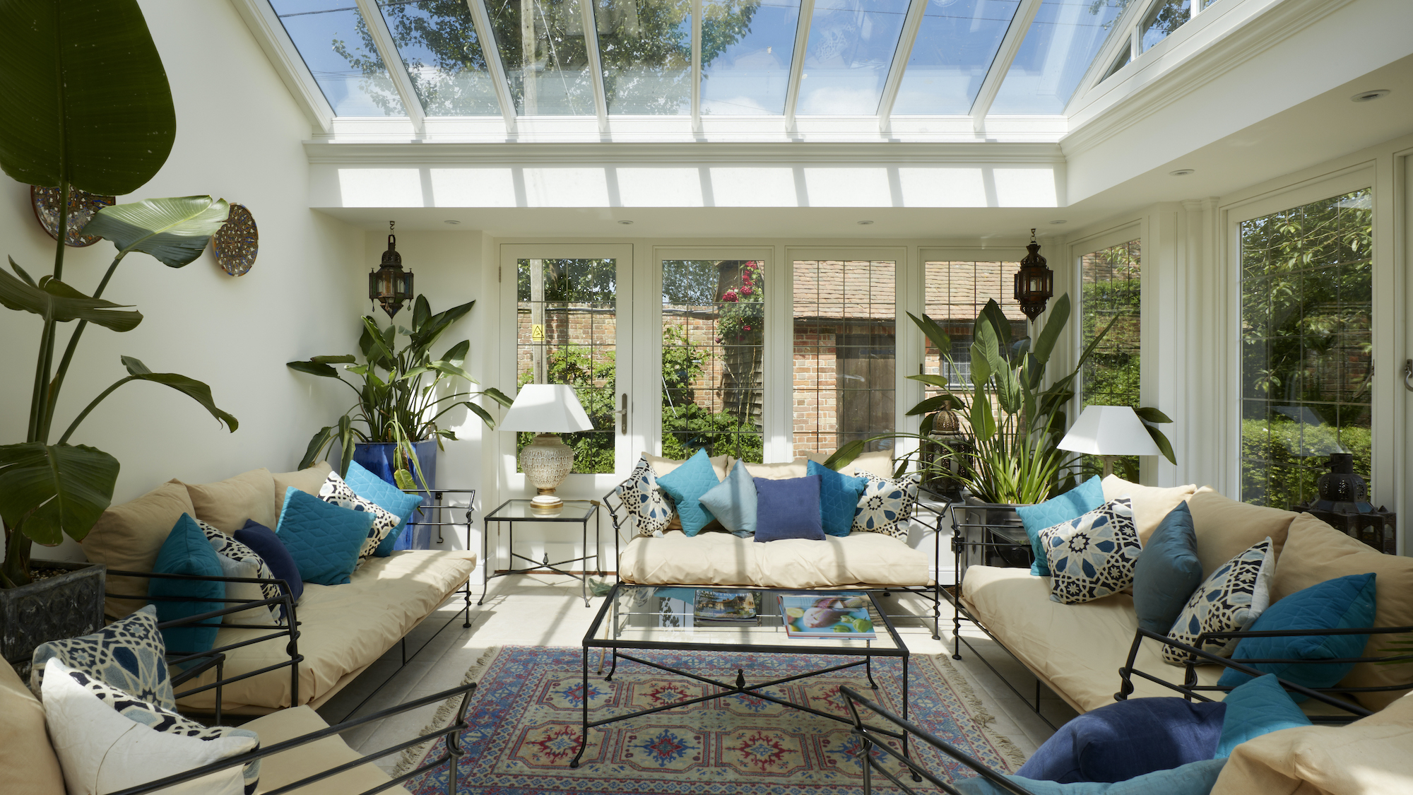 If you want to build a functional glazed extension and create a calming and relaxing atmosphere, you can install both openable and electric hinged flat glass rooflights to let more natural light in and provide proper airflow to the space. Other than that, depending on the primary purpose of your orangery, you can mix and match dining chairs for a rustic look, incorporate rattan elements, fill the space with living plants, and add some textiles for colourful accents.